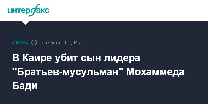 Каир. 17 августа. INTERFAX.RU - Сын духовного лидера египетского исламистского движения "Братья-мусульмане" Мохаммеда Бади погиб в Каире в пятницу в ходе столкновений исламистов с полицией, сообщило движение на своей странице в Facebook. Пока официальных заявлений по поводу распространенной информации не поступало, как не сообщаются и подробности.