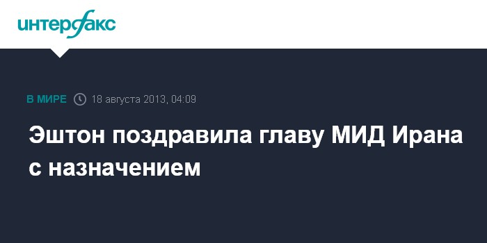 Брюссель. 18 августа. ИНТЕРФАКС - Верховный представитель ЕС по иностранным делам Кэтрин Эштон поздравила по телефону Мохаммада Джавада Зарифа с вступлением в должность министра иностранных дел Ирана, сообщила в субботу вечером пресс-служба главы европейской дипломатии.