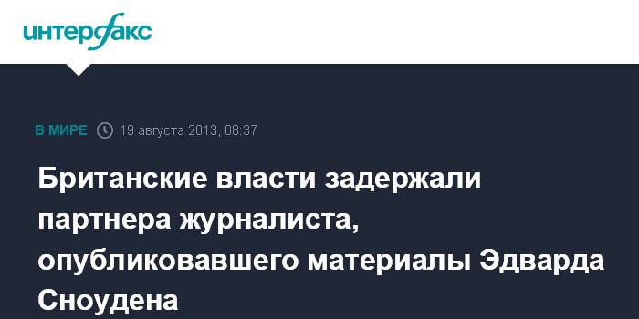Лондон. 19 августа. INTERFAX.RU - Власти Великобритании в воскресенье задержали в столичном международном аэропорту "Хитроу" Дэвида Миранду - партнера журналиста газеты The Guardian Гленна Гринвальда, отвечавшего за публикацию предоставленных Эдвардом Сноуденом материалов о деятельности спецслужб США.