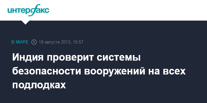 Дели. 19 августа. INTERFAX.RU - Власти Индии распорядились провести проверку систем обеспечения безопасности оружия на всех своих субмаринах после возгорания на борту подлодки "Синдуракшак", заявил в понедельник министр обороны страны Аракапарамбил Энтони.