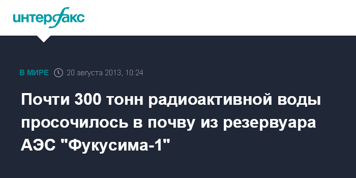 Токио. 20 августа. INTERFAX.RU - Компания-оператор АЭС "Фукусима-1" ТЕПКО (TEPCO) обнаружила утечку примерно 300 тонн радиоактивной воды из одного из 26 резервуаров станции, сообщает во вторник японский телеканал NHK.