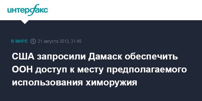 Вашингтон. 21 августа. INTERFAX.RU - Американские власти призывают Дамаск предоставить комиссии экспертов ООН по химическому оружию доступ к месту, где ранее в среду предположительно было использовано химическое оружие, заявил в среду на брифинге представитель Белого дома Джош Эрнст.