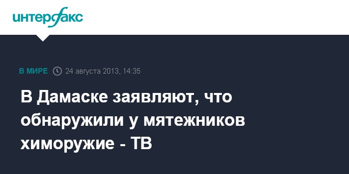 Бейрут. 24 августа. INTERFAX.RU - Сирийские власти заявляют, что нашли отравляющие химические вещества у бойцов оппозиции, сообщает в субботу сирийское государственное телевидение. По информации телевидения, химические вещества были обнаружены в подземных туннелях, прорытых мятежниками в столичном пригороде Джобар.