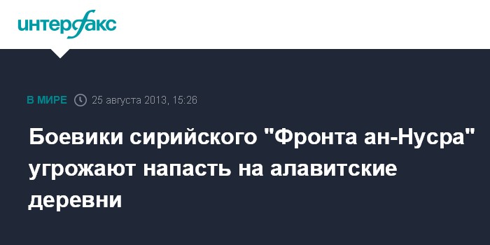 Бейрут. 25 августа. INTERFAX.RU - Члены сирийской радикальной группировки "Фронт ан-Нусра" в воскресенье пригрозили напасть на населенные пункты, в которых проживают алавиты, говорится в сообщении, распространенном на ряде исламистских сайтов.