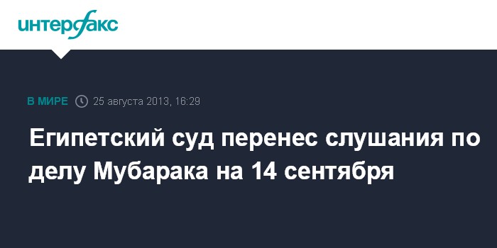 Каир. 25 августа. INTERFAX.RU - Суд Каира решил перенести слушания по делу экс-президента Египта Хосни Мубарака на 14 сентября, сообщает в воскресенье египетское государственное телевидение. О причинах такого решения суда не сообщается.