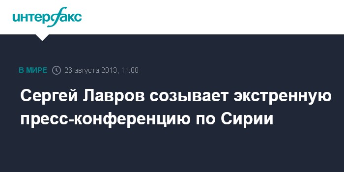 Москва. 26 августа. INTERFAX.RU - Министр иностранных дел России Сергей Лавров позже в понедельник даст экстренную пресс-конференцию в связи с развитием событий в Сирии и вокруг нее. Как стало известно "Интерфаксу", пресс-конференция начнется в 16:00 по московскому времени.