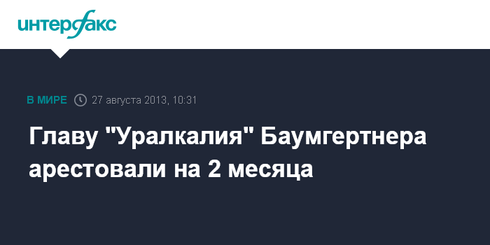 Минск. 27 августа. INTERFAX.RU - Генеральный директор "Уралкалия" Владислав Баумгертнер арестован в Минске на 2 месяца, но срок может быть продлен, ему назначен белорусский адвокат, сообщил агентству "Интерфакс" начальник отдела информации и связи с общественностью Следственного комитета Белоруссии Павел Траулько.