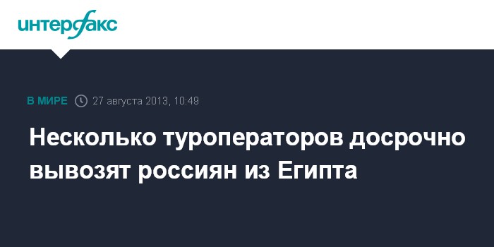 Москва. 27 августа. INTERFAX.RU - Выезд российских туристов с курортов Египта происходит в плановом режиме, однако некоторые туроператоры досрочно вывозят своих клиентов, сообщила порталу "Интерфакс-Туризм" пресс-секретарь Ростуризма Ирина Щеголькова.