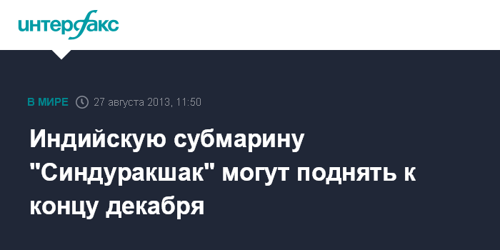 Дели. 27 августа. INTERFAX.RU - Индийскую подводную лодку "Синдуракшак", затонувшую после взрыва, планируется поднять к Новому году. "Дай Бог, лодку поднять к Новому году. Как только она будет поднята, комиссия начнет разбираться в причинах", - сообщил "Интерфаксу" военно-дипломатический источник в Дели.