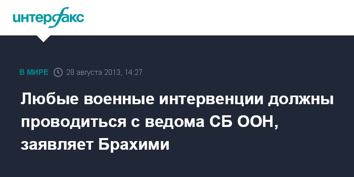 Женева. 28 августа. INTERFAX.RU - Все военные интервенции в мире, согласно действующим законам, должны проводиться только с разрешения СБ ООН, заявил в среду спецпредставитель ООН и ЛАГ по Сирии Лахдар Брахими.