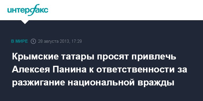 "21 августа из разных СМИ… мне стало известно, что Панин после ДТП, которое произошло 20 августа в г. Алушта с его участием, в интервью СМИ относительно обстоятельств ДТП допустил крайне оскорбительные высказывания в адрес крымских татар и прямые призывы к жителям Крыма к совершению ими противоправных действий в отношении крымских татар", - говорится в заявлении Чубарова, которое было направлено 27 августа в крымскую прокуратуру, размещенном на официальном сайте Меджлиса.