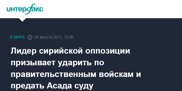 Париж. 29 августа. INTERFAX.RU - Западные страны должны провести военную операцию против правительственных войск в Сирии и начать расследование в отношении президента Башара Асада в Международном уголовном суде (МУС), заявил в четверг глава Национальной коалиции сирийских революционных и оппозиционных сил (НКСРОС) Ахмад Джарба в интервью французской газете Le Parisien.