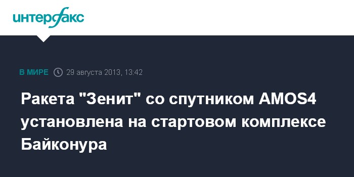 Байконур. 29 августа. INTERFAX.RU - Ракета космического назначения "Зенит-3SLБ" ("Зенит-3М") с космическим аппаратом AMOS4 в четверг установлена на стартовом комплексе площадки N45 Байконура, сообщил агентству "Интерфакс-Казахстан" источник на космодроме.