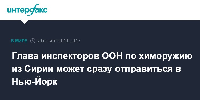 Дубай. 30 августа. INTERFAX.RU - Руководитель группы экспертов ООН по химическому оружию, вероятно, отправится в Нью-Йорк сразу после завершения работы в Сирии, передал в четверг межарабский телеканал "Аль-Арабийя".