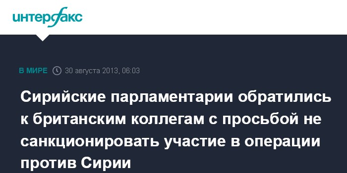 Лондон. 30 августа. ИНТЕРФАКС - Парламентарии Сирии в четверг, накануне голосования в британском парламенте по сирийской проблеме, направили открытое послание парламентариям Великобритании, в котором предупредили, что планируемая военная операция против Сирии приведет к дестабилизации в регионе.