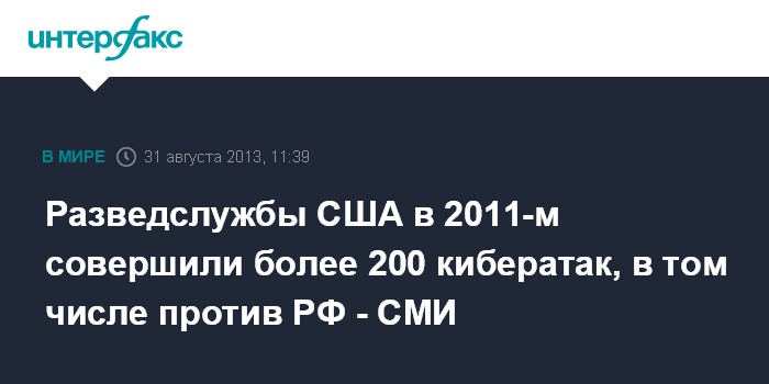 Вашингтон. 31 августа. INTERFAX.RU - Американские спецслужбы в 2011 году провели 231 кибератаку против сетей иностранных государств, в том числе России, сообщает американская газета The Washington Post со ссылкой на материалы, переданные экс-сотрудником ЦРУ Эдвардом Сноуденом.
