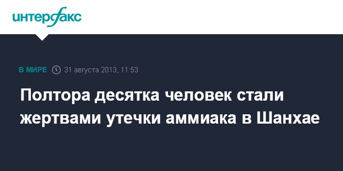 Пекин. 31 августа. INTERFAX.RU - 15 человек погибли в результате утечки аммиака из холодильной установки в китайском Шанхае, сообщает в субботу гонконгская газета "Саут чайна морнинг пост". В сообщении говорится, что еще 26 человека пострадали. Трагедия произошла на севере города на одном из складов замороженных морепродуктов.