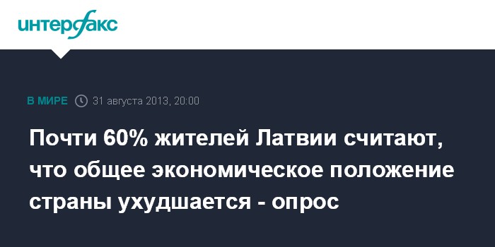 Рига. 31 августа. INTERFAX.RU - Более половины жителей Латвии считают, что общее экономическое положение в стране ухудшается, что на четыре процентных пункта больше, чем в предыдущем месяце, показал проведенный в июле опрос "Латвийский барометр DNB".