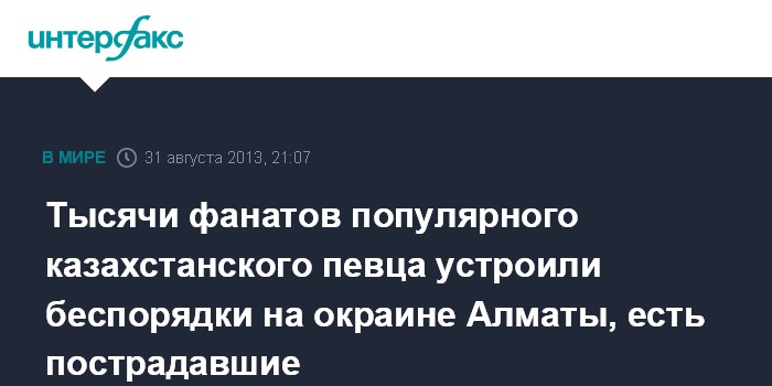 Алматы. 31 августа. INTERFAX.RU - Тысячи поклонников популярного казахстанского певца Кайрата Нуртаса, недовольные концертом, на окраине Алматы близ торгово-развлекательного центра "Прайм Плаза" устроили беспорядки, сообщили агентству "Интерфакс-Казахстан" очевидцы.