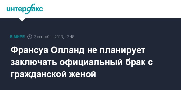 Париж. 2 сентября. INTERFAX.RU - Валери Триервейлер, гражданская жена президента Франции Франсуа Олланда, заявила французским СМИ, что у президентской пары сейчас нет плана официально заключить брак.