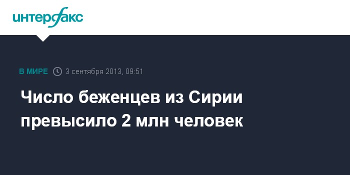 Нью-Йорк (ООН). 3 сентября. INTERFAX.RU - Число беженцев, покинувших Сирию с начала внутреннего конфликта, превысило 2 млн человек, сообщило Управление верховного комиссара ООН по делам беженцев.