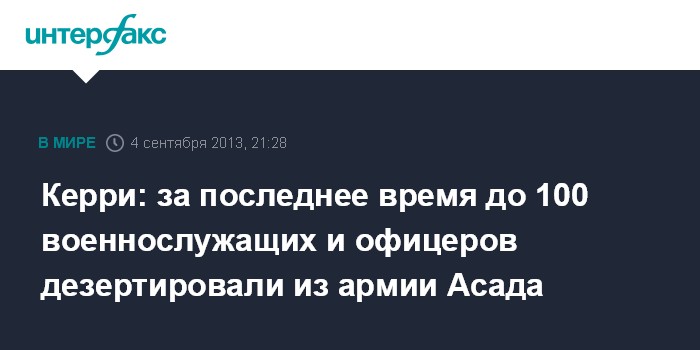 По словам Керри, данные разведки подтверждают, что за последнее время от 60 до 100 офицеров и солдат дезертировали из сирийской армии.