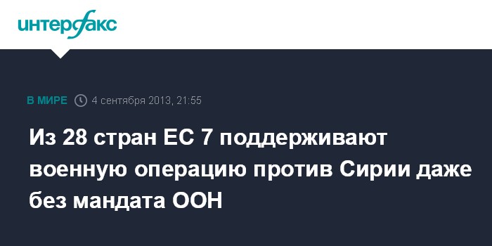 Брюссель. 4 сентября. INTERFAX.RU - Из 28 стран Европейского союза 6 государств, помимо Франции, "не колеблясь", поддерживают военное вмешательство в Сирию "даже без мандата ООН": это Дания, Греция, Кипр, Латвия, Румыния, Хорватия, сообщил в среду интернет-сайт RTL.be.