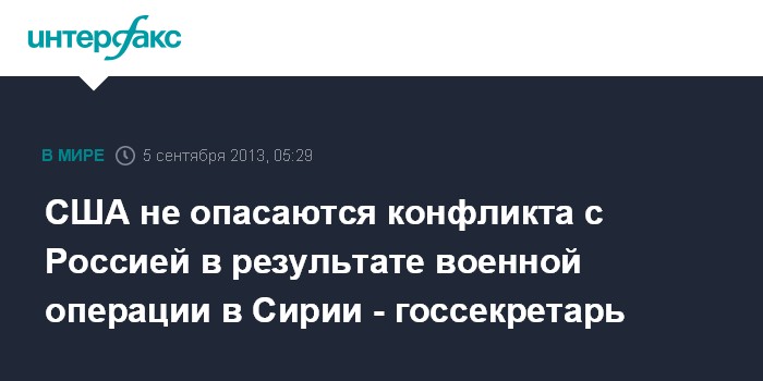 "Российский министр Лавров (глава МИД РФ Сергей Лавров - ИФ) четко заявил, что Россия не намерена воевать за Сирию. И в личных беседах со мной президент Путин и министр (С.Лавров - ИФ) дали понять, что сирийский вопрос не поднимется на такой уровень потенциального конфликта. Их корабли (в Средиземном море - ИФ) находятся на достаточном расстоянии. Они не несут угрозы. Не думаю, что там что-то произойдет", - сказал он.