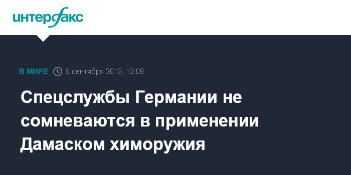 Берлин. 5 сентября. INTERFAX.RU - Спецслужбы Германии не сомневается в причастности сирийского режима к применению химоружия 21 августа, даже если это невозможно доказать напрямую.
