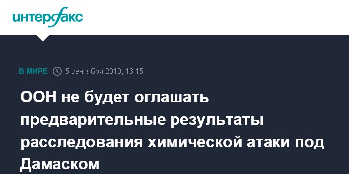 Стрельна (Санкт-Петербург). 5 сентября. INTERFAX.RU - ООН не будет оглашать предварительных результатов расследования, проведенного на месте предполагаемой химической атаки, осуществленной 21 августа в Сирии в пригороде Дамаска.