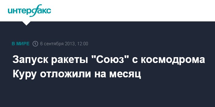 Москва. 6 сентября. INTERFAX.RU - Планировавшийся на 30 сентября запуск ракеты-носителя "Союз-СТ" с космодрома Куру во Французской Гвиане перенесен примерно на месяц, сообщили в пятницу "Интерфаксу" в российской ракетно-космической отрасли.