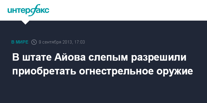 Вашингтон. 9 сентября. INTERFAX.RU - Власти американского штата Айова официально разрешили слепым гражданам получать лицензии на приобретение огнестрельного оружия и носить его в публичных местах, сообщает сайт американского издания Huffington Post.