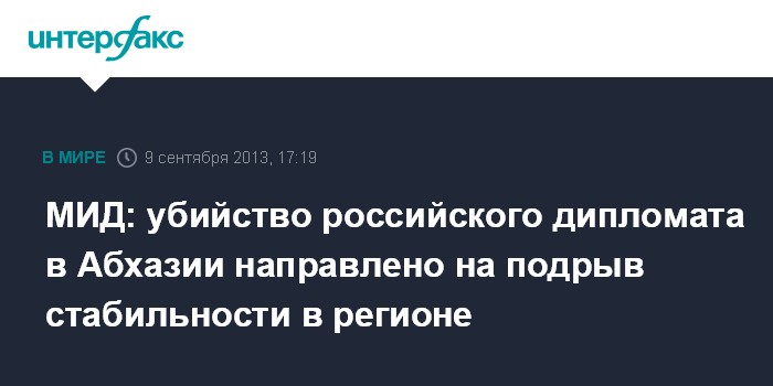 Москва. 9 сентября. NTERFAX.RU - Убийство первого секретаря посольства России в Абхазии Дмитрия Вишернева нацелено на подрыв российско-абхазских отношений и мира, как в самой этой стране, так и в регионе, заявили в МИД России.