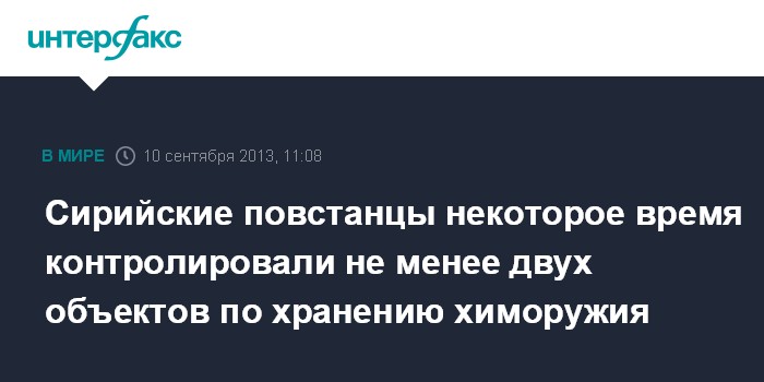 Москва. 10 сентября. INTERFAX.RU - Арсенал сирийского химического оружия находится под контролем правительственных сил, однако, по меньшей мере, в двух городах объекты по производству или хранению этого оружия на некоторое время переходили под контроль повстанцев, говорится в докладе, распространенном израильским Институтом по борьбе с терроризмом (ICT).