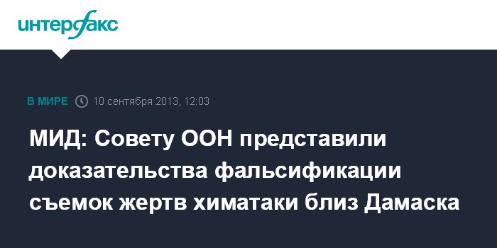 Москва. 10 сентября. NTERFAX.RU - Убедительные доказательства фальсификации фотографий и видеосъемок с жертвами химатаки в пригороде Дамаска 21 августа были продемонстрированы участникам состоявшегося в ходе 24-й сессии Совета ООН по правам человека брифинга "Права человека и вооруженные конфликты: угрозы США применить силу против Сирии и международное право", заявили в МИД России.