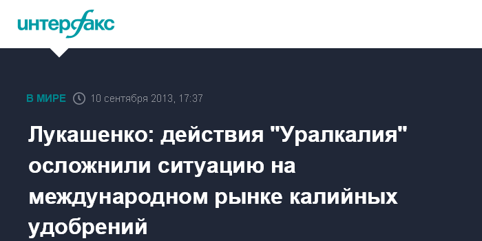 Минск. 10 сентября. INTERFAX.RU - Президент Беларуссии Александр Лукашенко заявил, что с реализацией калийных удобрений сложились определенные проблемы, действия акционеров Белорусской калийной компании со стороны "Уралкалия" осложнили ситуацию на международном рынке калийных удобрений.