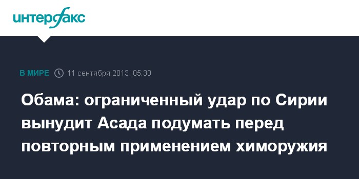 "Я не пошлю войска в Сирию, удар будет ограниченным. Только Америка своим ограниченным ударом может подать сигнал Асаду. Ограниченный удар по Сирии может вынудить диктатора Асада подумать дважды перед тем, как снова применить химоружие", - сказал Б.Обама.