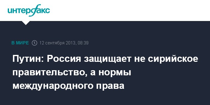Москва/Вашингтон. 12 сентября. INTERFAX.RU - Президент РФ Владимир Путин в своей статье, опубликованной в четверг в американской газете The New York Times, заявил, что Москва в сирийском конфликте не защищает режим Башара Асада, а выступает в поддержку соблюдения норм международного права.