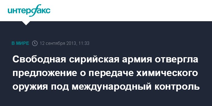 Дубай. 12 сентября. INTERFAX.RU - Бойцы Свободной сирийской армии (ССА) категорически отказываются от предложения России о передаче Сирией химического оружия под международный контроль, заявил глава генштаба оппозиционной ССА генерал Селим Идрисс.