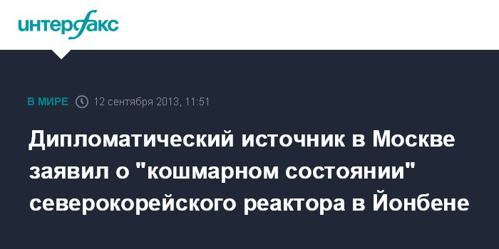 Москва. 12 сентября. ИНТЕРФАКС - В Москве опасаются, что перезапуск КНДР ядерного реактора в Йонбене может обернуться крупной техногенной катастрофой на Корейском полуострове.
