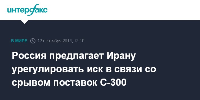 Москва. 12 сентября. INTERFAX.RU - Россия передала Ирану свое предложение с целью урегулирования иска Тегерана в международном арбитраже по прежнему контракту на поставку зенитно-ракетных комплексов С-300 и рассчитывает на успешное разрешение этой проблемы, заявил помощник президента России Юрий Ушаков.