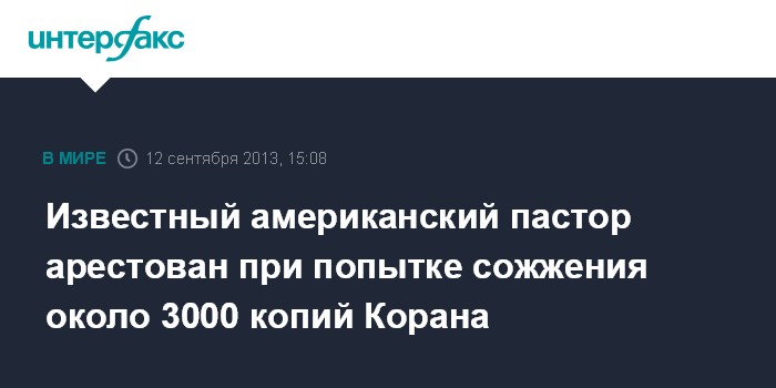 Вашингтон. 12 сентября. INTERFAX.RU - Полицейские американского штата Флорида арестовали пастора Терри Джонса при попытке сожжения 2998 копий Корана в память о терактах 11 сентября 2011 года в США, сообщает в четверг американская газета Orlando Sentinel.