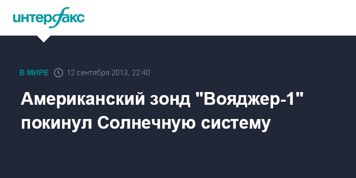 Вашингтон. 12 сентября. INTERFAX.RU - Американский зонд "Вояджер-1" после 35-летнего путешествия миновал границу Солнечной системы и вышел в межзвездное пространство, сообщил в четверг астрофизик Марк Свисдак из Мэрилендского университета. "Впервые человечество смогло выйти из колыбели Солнечной системы, чтобы исследовать галактику", - сказал он.