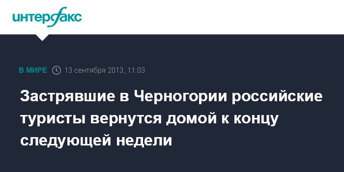 Москва. 13 сентября. INTERFAX.RU - Российские туристы, застрявшие в Черногории из-за конфликта между бывшим и нынешним руководством туроператора "ТТС Партнер" приедут домой к концу следующей недели.