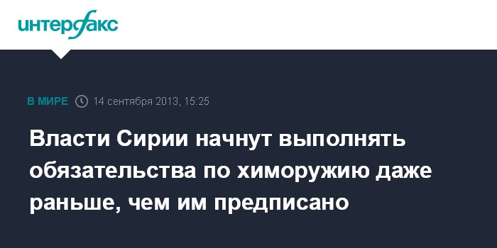 Женева. 14 сентября. INTERFAX.RU - Дамаск начнет выполнять свои обязательства в сфере химического разоружения в течение 30 дней, то есть раньше, чем взятые им на себя обязательства в этой области формально вступят в силу, заявил глава МИД РФ Сергей Лавров.