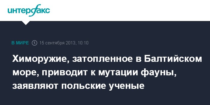Калининград. 15 сентября. INTERFAX.RU - Химическое оружие, затопленное после Второй Мировой войны в Балтийском море, вызывает генетические изменения у рыбы, утверждают ученые из Польши.