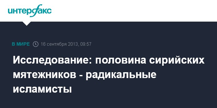 Лондон. 16 сентября. INTERFAX.RU - Сторонники джихада и представители радикальных исламистских группировок составляют почти половину мятежников, ведущих борьбу против сирийского президента Башара Асада, сообщает в понедельник британская газета Daily Telegraph со ссылкой на исследование издания Jane's, специализирующегося на военной тематике.