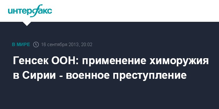 Нью-Йорк (ООН). 16 сентября. INTERFAX.RU - Военным преступлением назвал в понедельник генеральный секретарь ООН Пан Ги Мун использование химического оружия в Сирии.