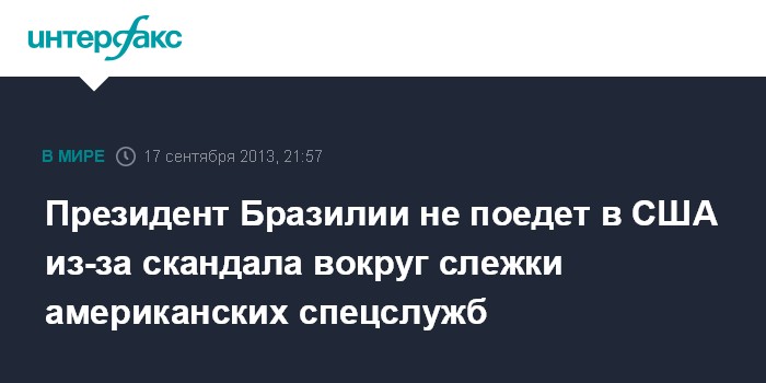 Бразилиа. 17 сентября. INTERFAX.RU - Президент Бразилии Дилма Руссефф отменила запланированный на октябрь визит в США в связи с появлением информации об электронном шпионаже Агентства национальной безопасности США (АНБ) за гражданами Бразилии, сообщает во вторник бразильский телерадиоканал Globo.