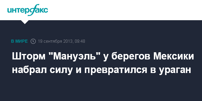 Мехико. 19 сентября. INTERFAX.RU - Тропический шторм "Мануэль", находящийся близ мексиканского тихоокеанского побережья в ночь на четверг усилился до уровня урагана, сообщает Национальный центр исследования ураганов в США.